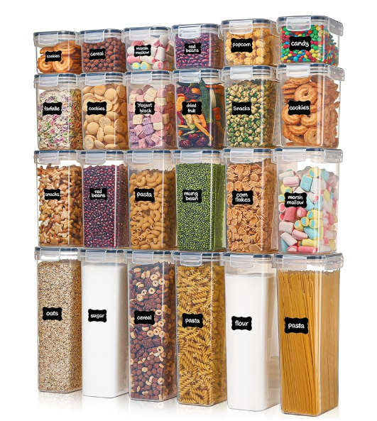 - 4 Size Combinations Fit Your Needs — Our kitchen storage container set comes in 4 different sizes. Includes 6 Tall Container (2.5quart/2.8 liters), 6 Large Containers (1.8quart/2.0 liters), 6 Medium Containers (1.5quart/1.6 liters), 6 Small Containers (0.7quart/0.8 liters). Perfect for storing spaghetti, baking supplies, cereal, flour, sugar, oats, pasta, rice, coffee, tea, snacks, nuts and other dry goods.